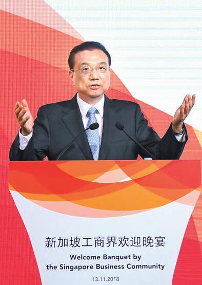 人民网新加坡11月13日电 (记者张慧中、赵益普)国务院总理李克强当地时间11月13日晚在新加坡出席新加坡工商联合总会和中华总商会联合举办的欢迎晚宴并致辞。